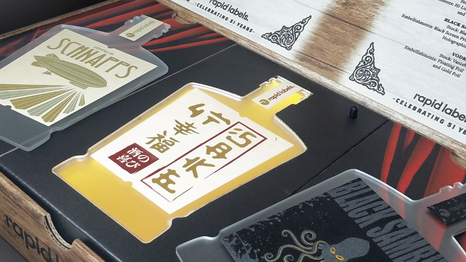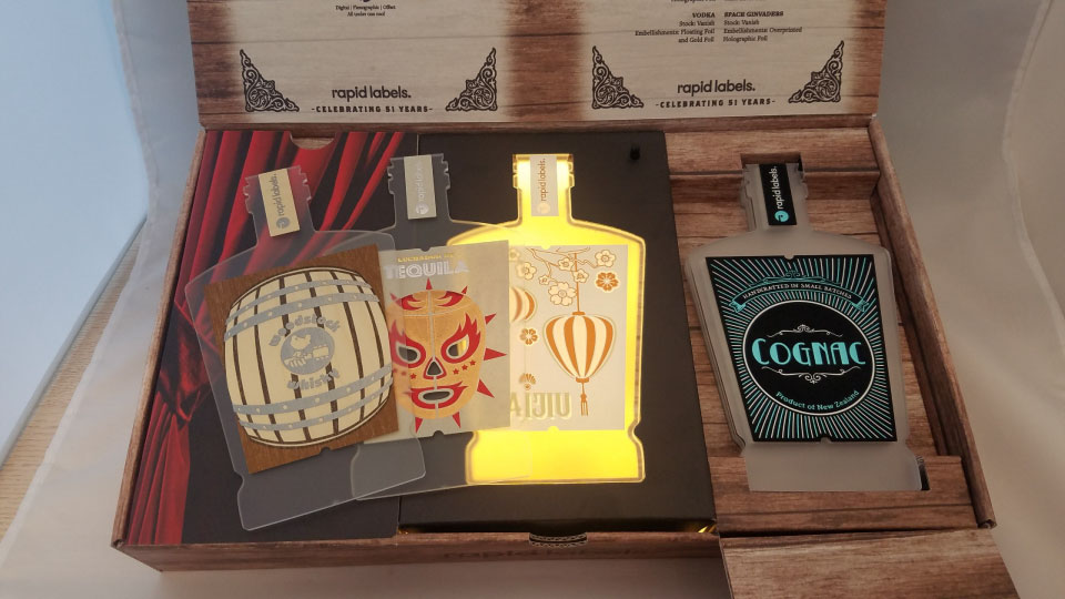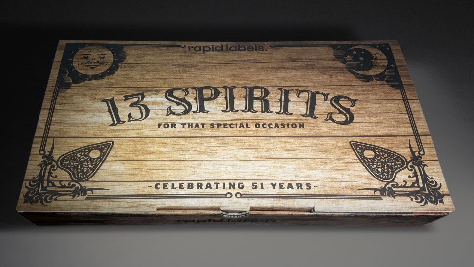 Released in September 2019, this package, celebrating the 51st year of Rapid Labels, was created as both a keepsake and also an inspirational showcase of ideas. The box contains 13 contour cut flat acrylic bottles each featuring a label for a faux alcohol brand.